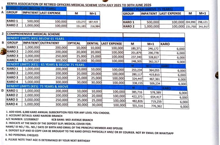 - Pay premiums, subcription fee and registration fee to KARO KCB Account NO. 1219580627, KARO NAIROBI BRANCH For enquiries kindly call 0745961191,0720830036, 0794472643.